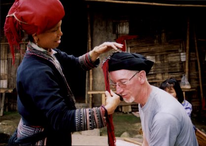 Red Hmong lady trying me out for a turban - I didn't buy this one | |